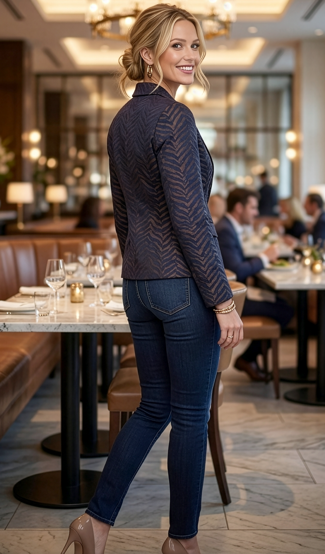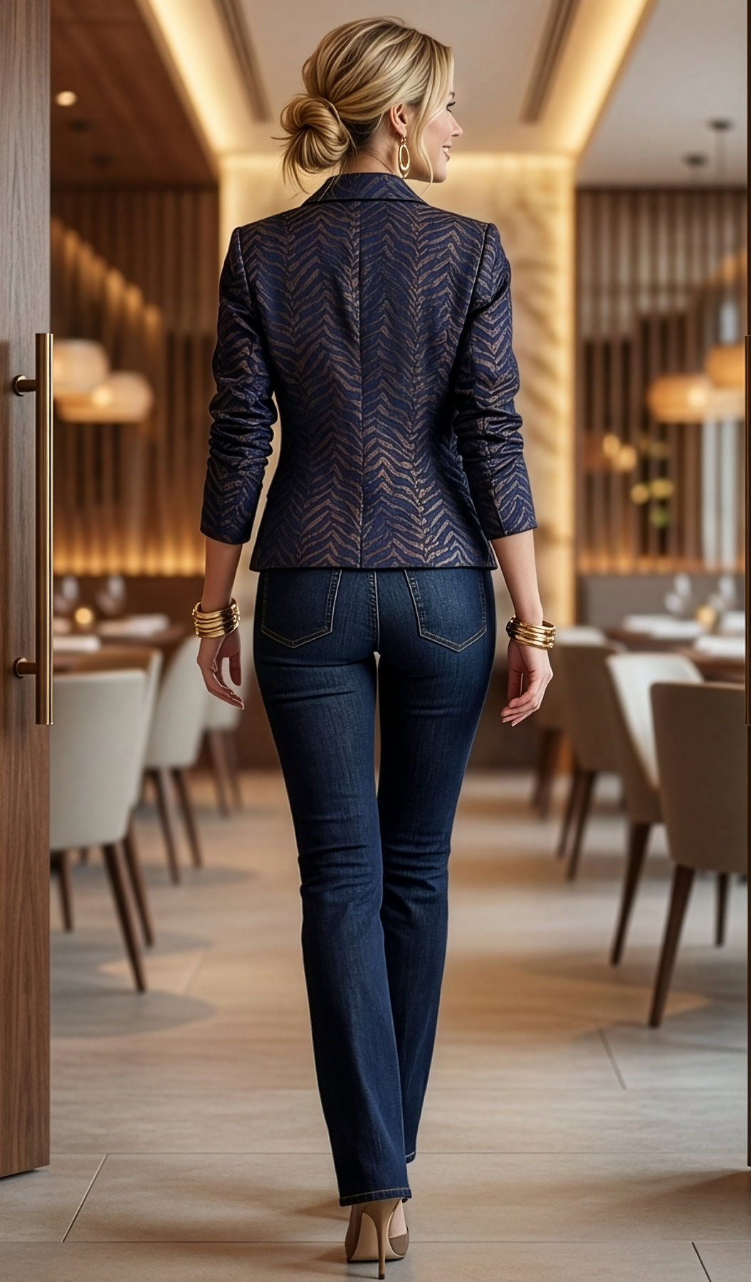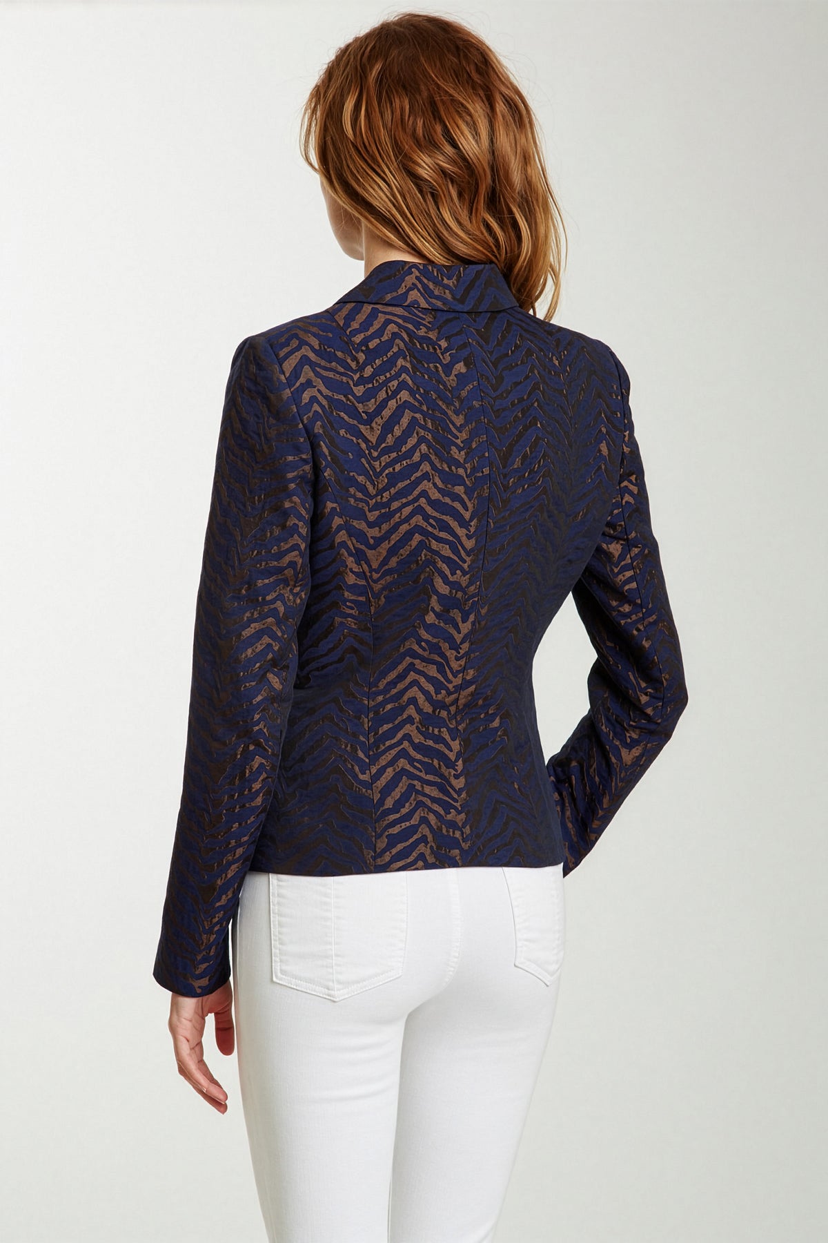 Shine on the job with a brocade blazer with metallic details. Or dress it up for evening drinks with friends.