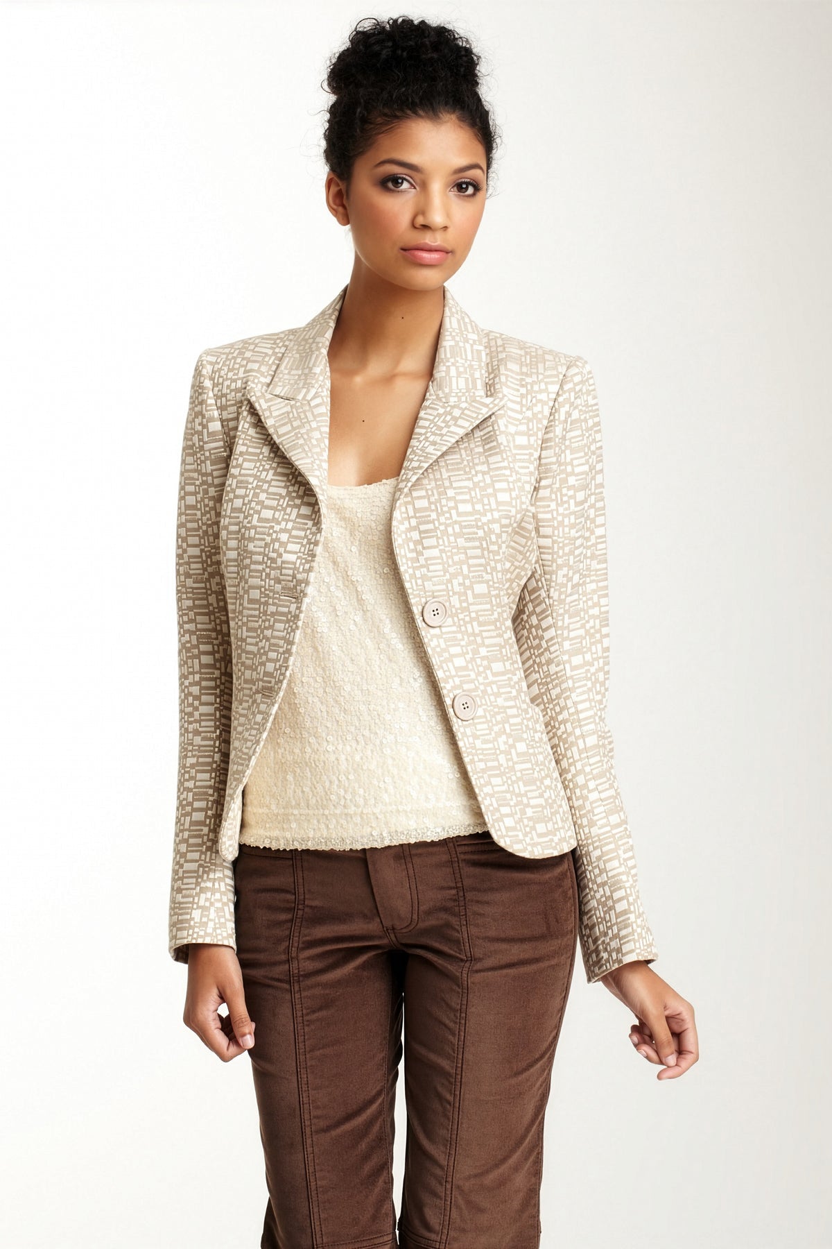 Shine on the job with a brocade blazer with metallic details. Or dress it up for evening drinks with friends.