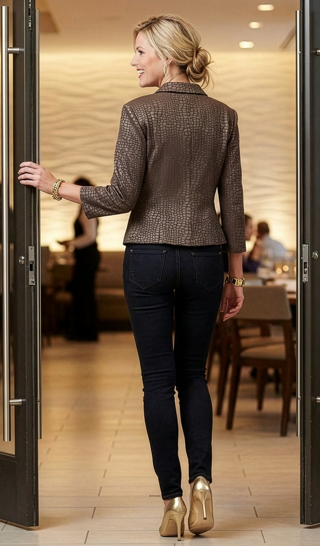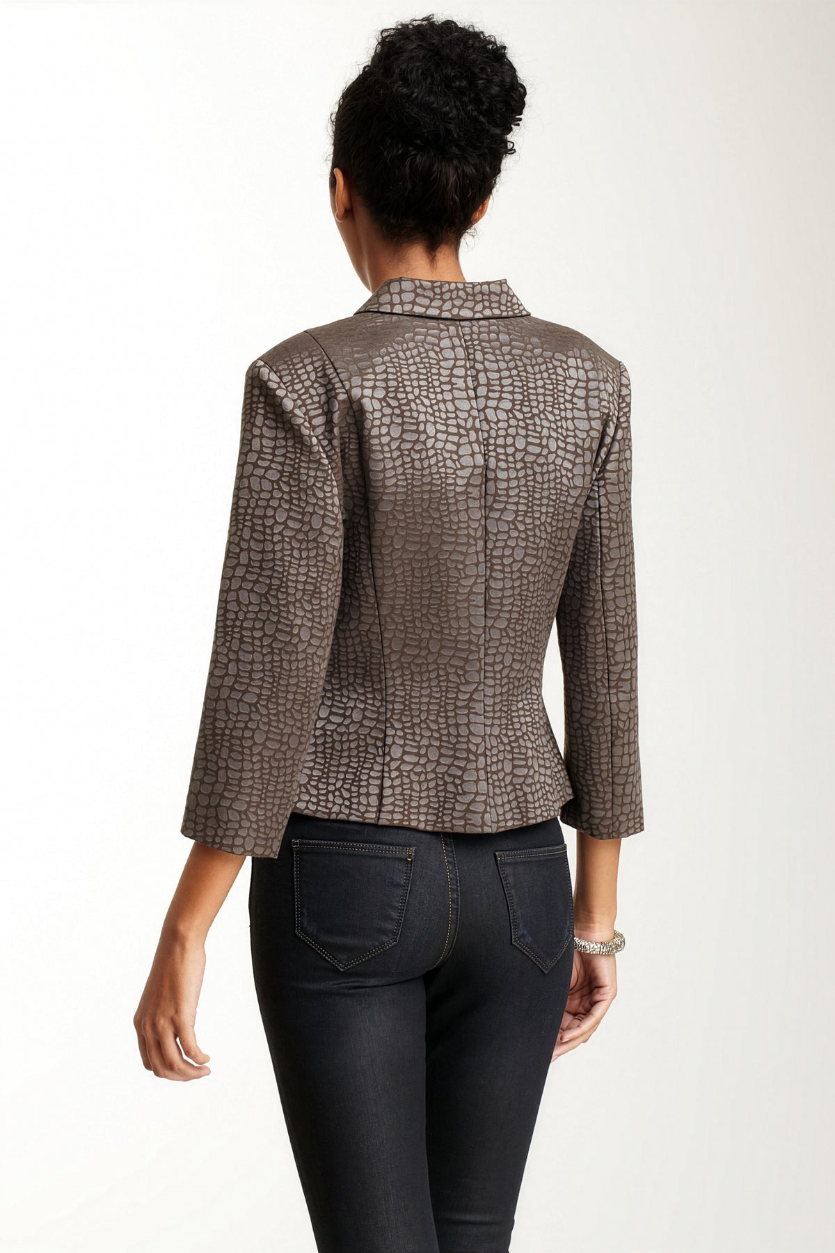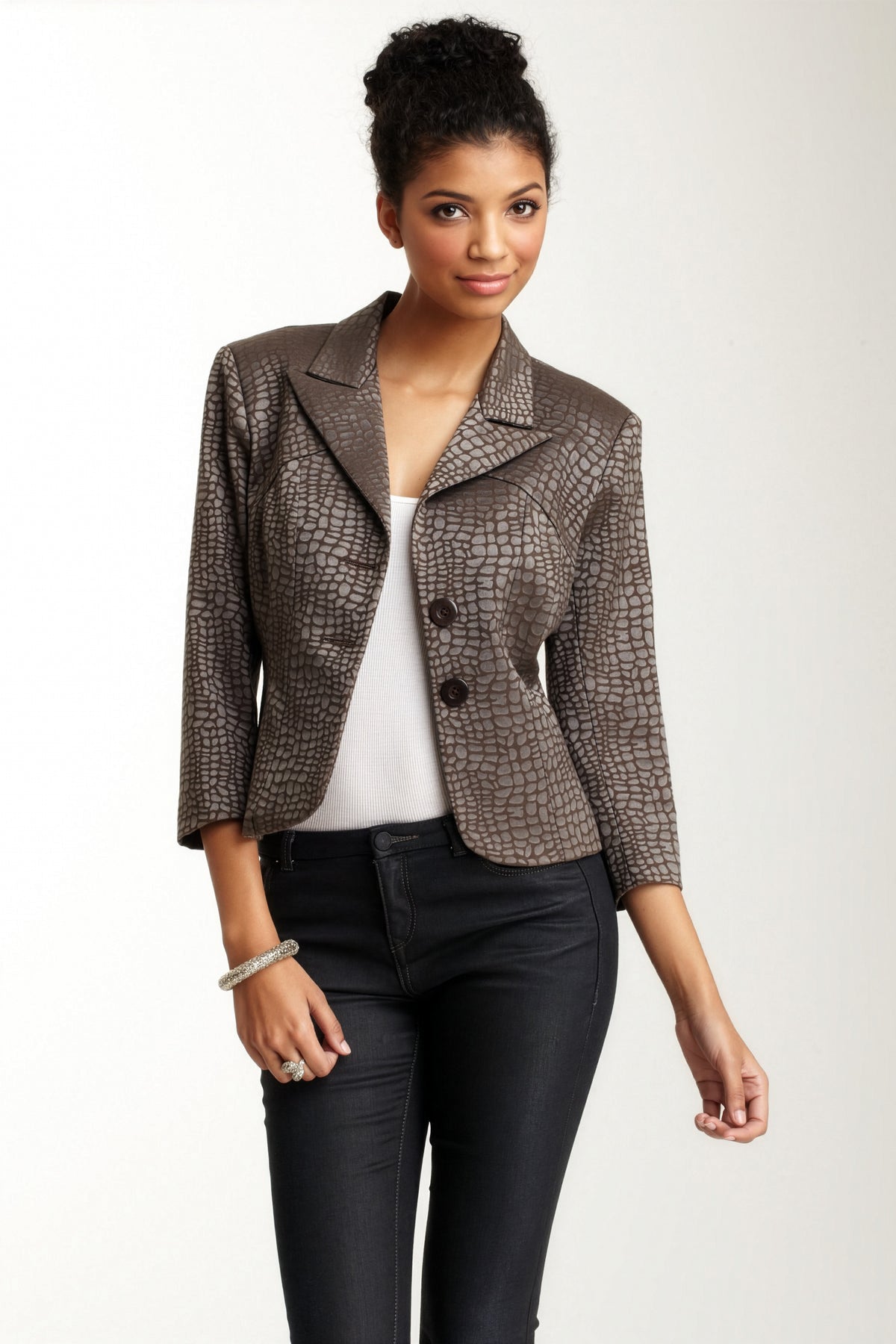 Shine on the job with a brocade blazer with metallic details. Or dress it up for evening drinks with friends.