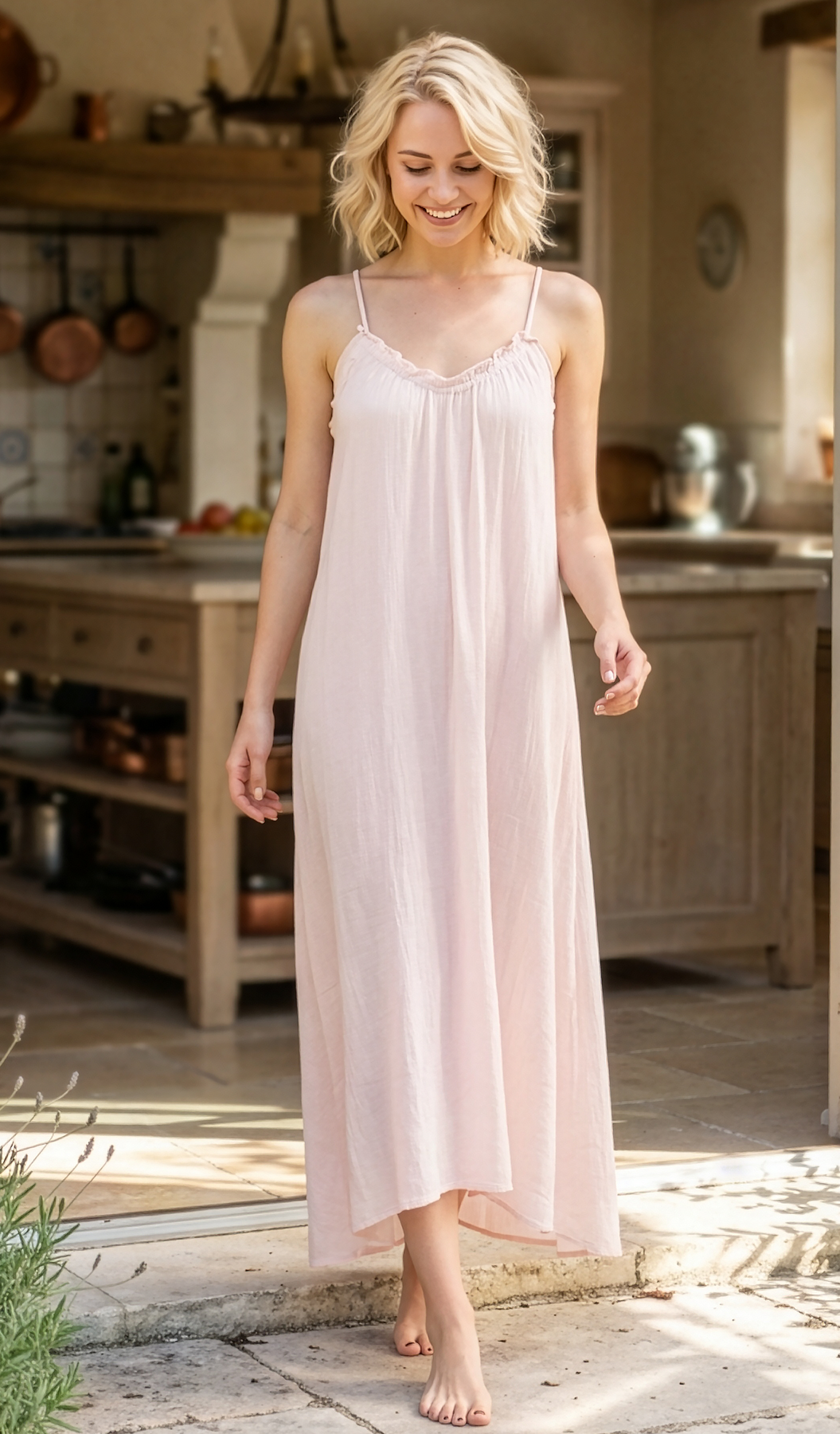 A fun racerback gown with ruffles on the neckline and cut at the ankle for effortless lounging around the house.
