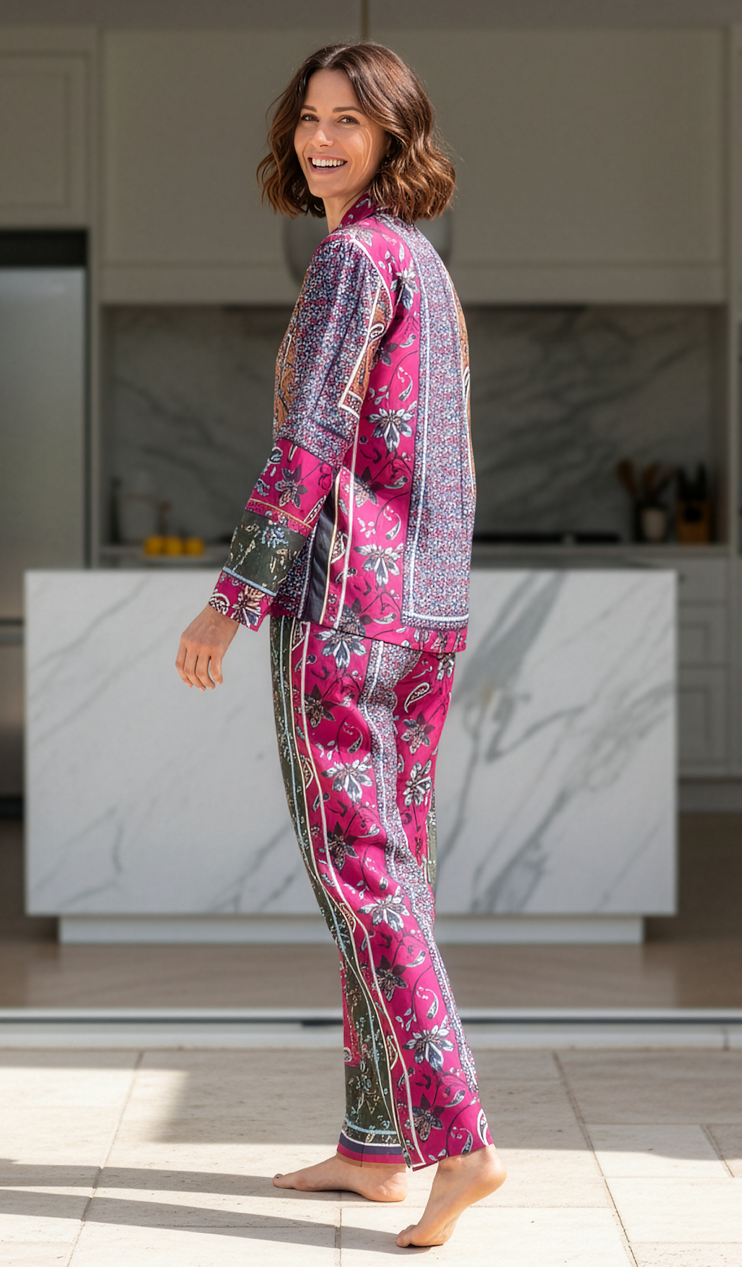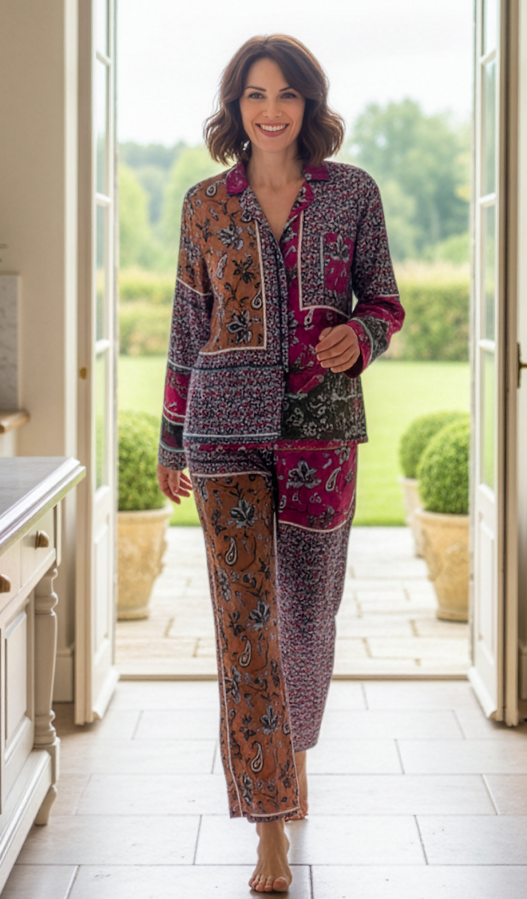 This luxurious PJ set is crafted from a blend of cotton and silk for a soft and natural feel. Enjoy the English Garden design for a subtle yet beautiful look. Spend your nights in luxury with this beautiful pajama set.