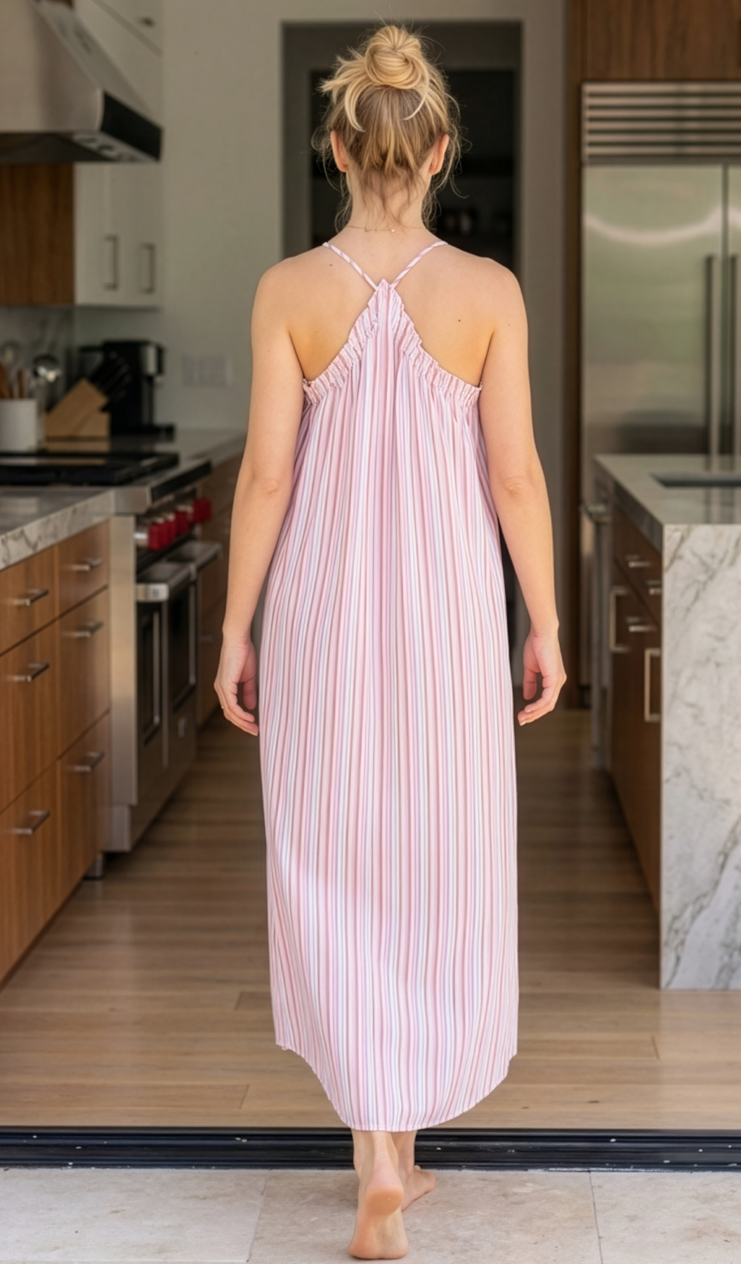 A fun racerback gown with ruffles on the neckline and cut at the ankle for effortless lounging around the house.