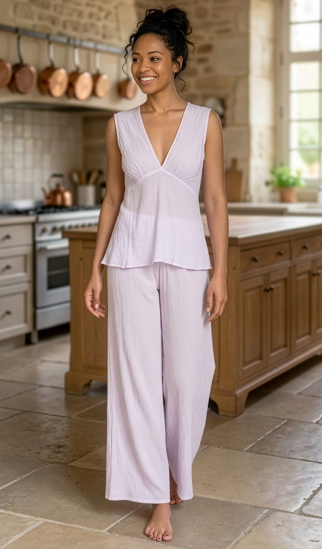 A sexy V-neck sleep set with a plunging back and a tie across the back shoulders. The pants have a semi-high slit for a flowy and effortless, put-together lounge look. Light & airy cotton is ideal for warm weather.