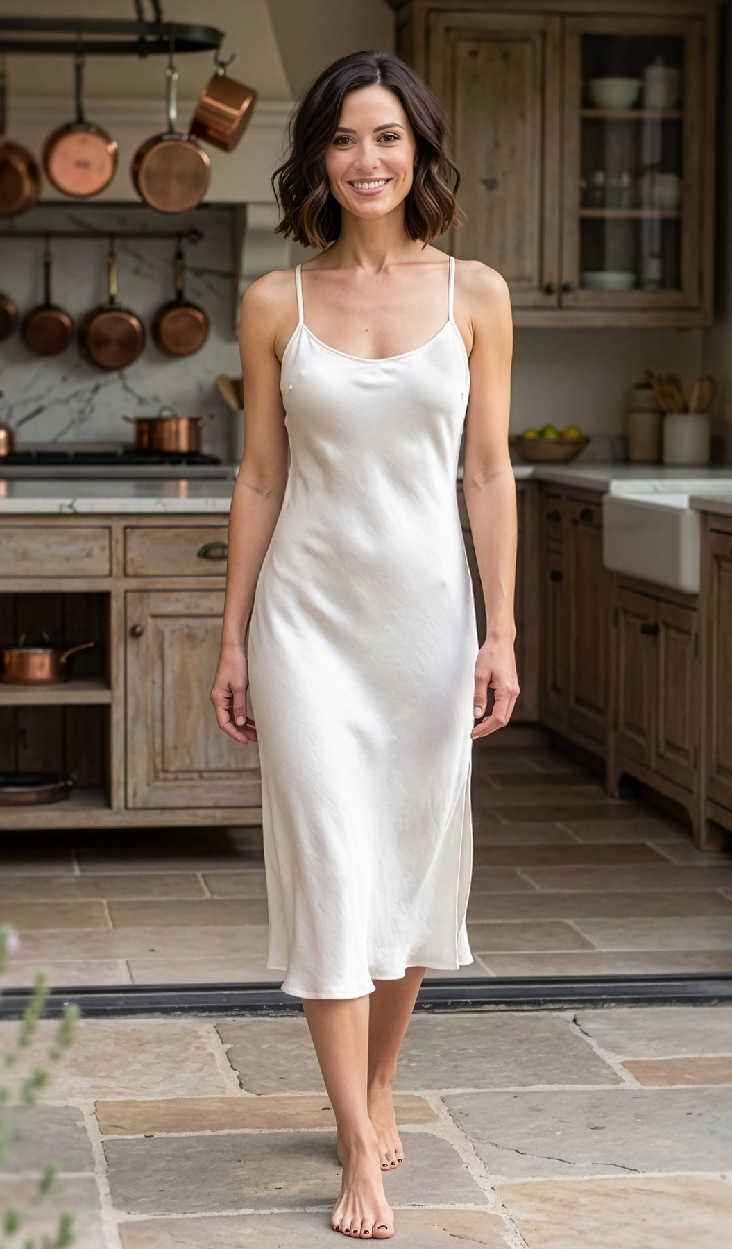 Meant for luxe lounging, this satiny slip dress features a T-back strap and an airy stem-showing side slit.