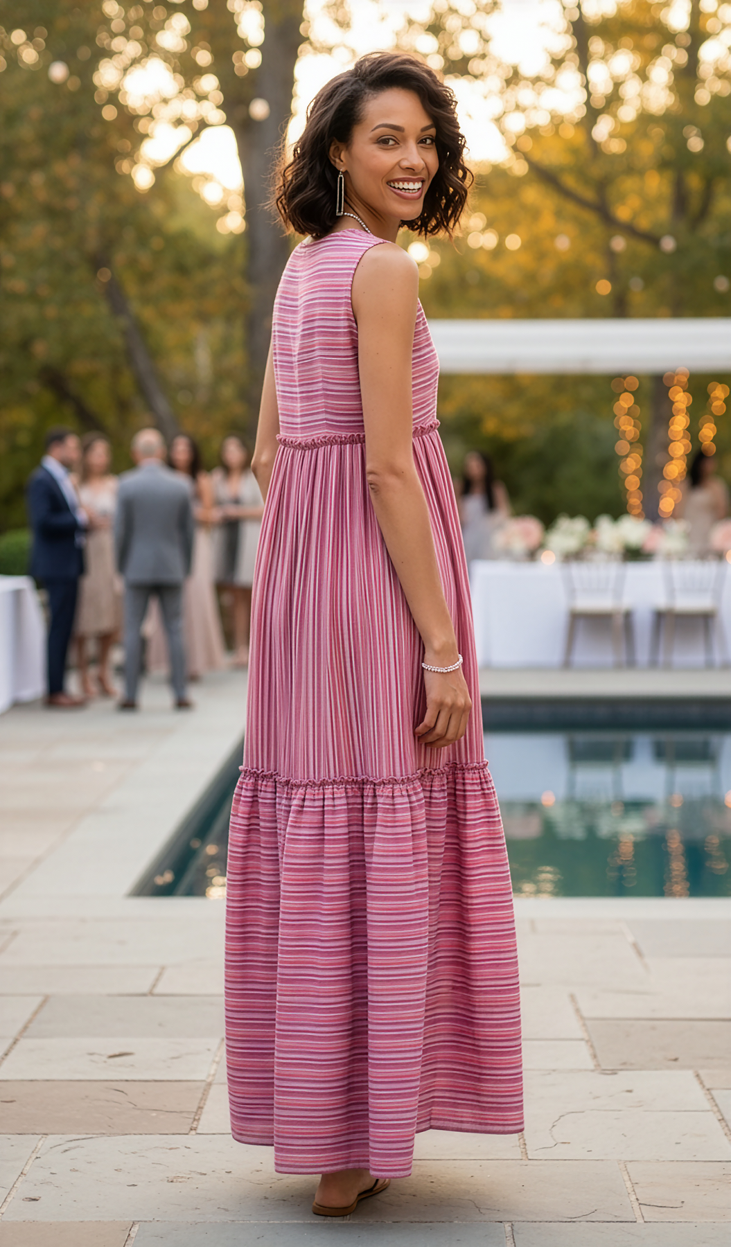 This full-skirted maxi is patterned in a berry stripe both vertical and horizontal stripes and the metallic tassels add to the charm.