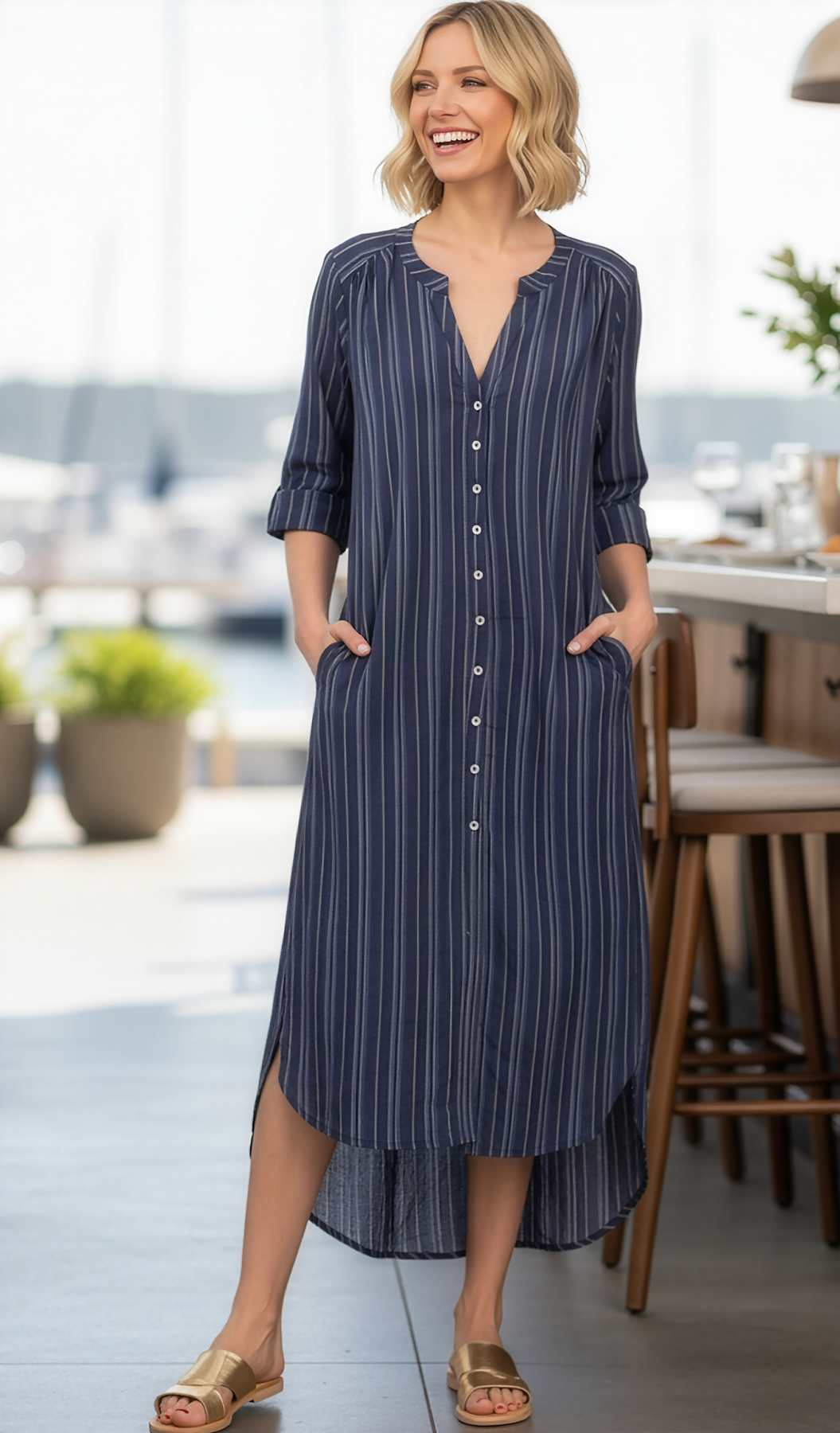 The Carley Caftan features 3/4 sleeves and a high-low hemline.