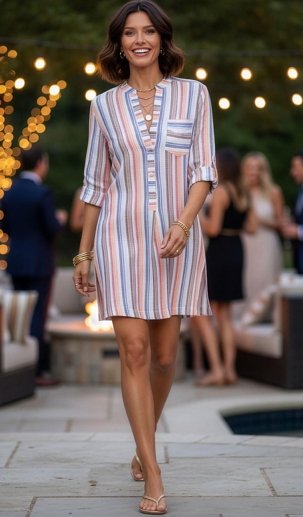 Easy and chic linen cover-up shirt dress featuring an effortless shapeless silhouette, fold over collar with button-up front, long sleeves and high slits on the sides. Runs slightly smaller.