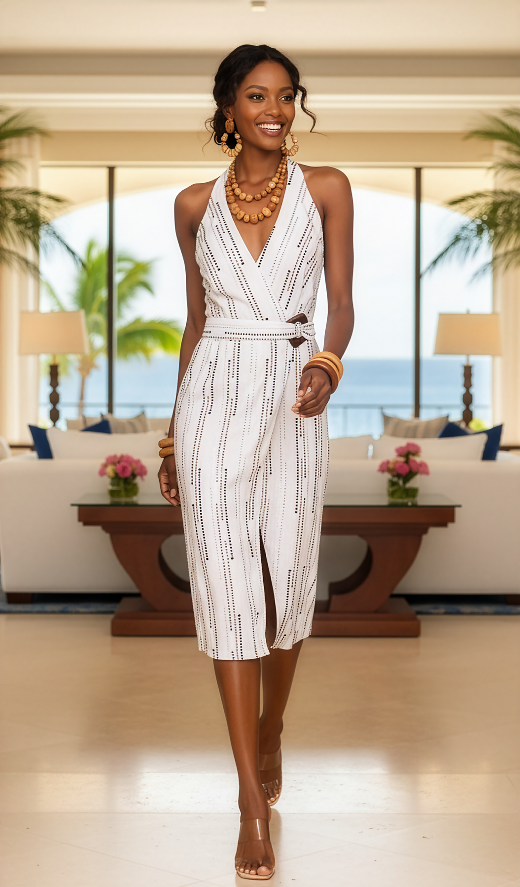 Stella wrap halter dress with wooden buckle detail has a slim fit. Perfect for summer soirée! This dress run a little small/contemporary & the slit is pretty high.