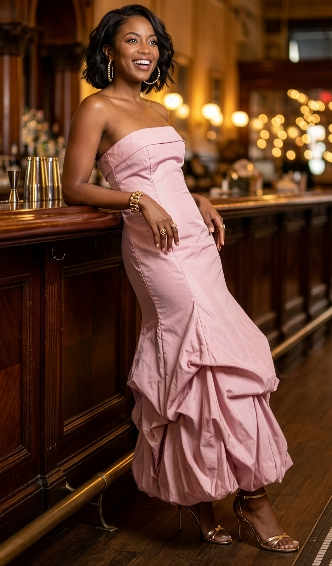 Our New COLLAB with Polli Says features a stunning evening gown that is perfect for a dressy occasion. Stretch Taffeta holds your body in this gorgeous glamorous evening dress to give a beautiful form fitting look. Cinched up all over with ties on the skirt to give a crushed balloon look with layers & layers of sumptuous fabric.