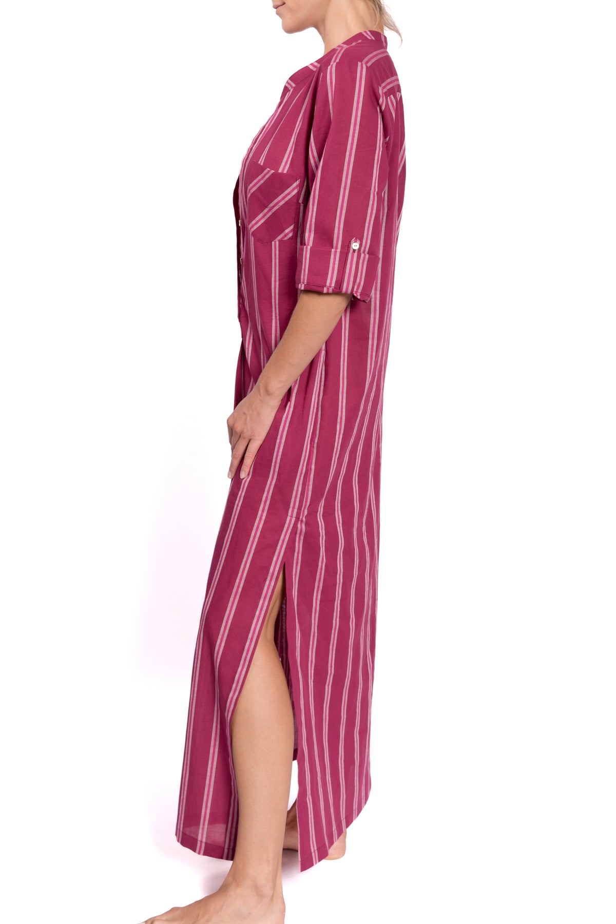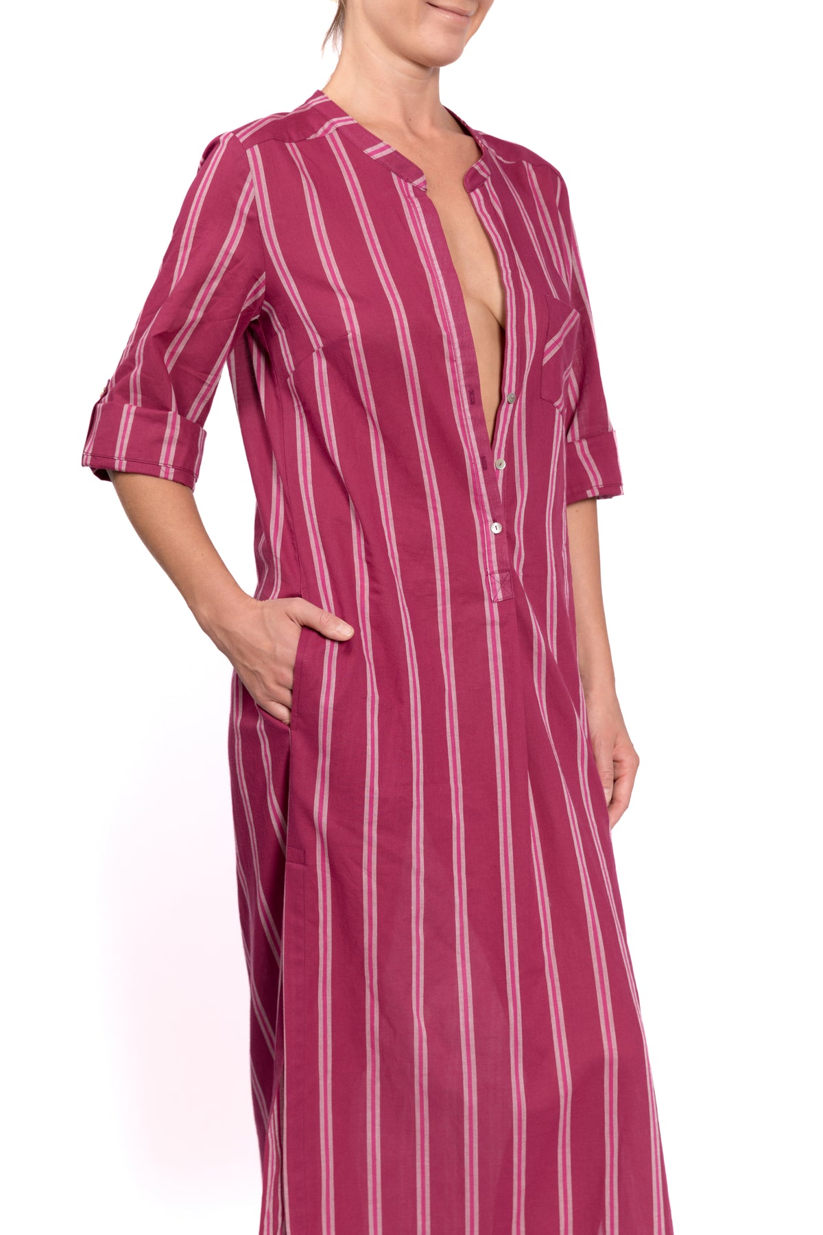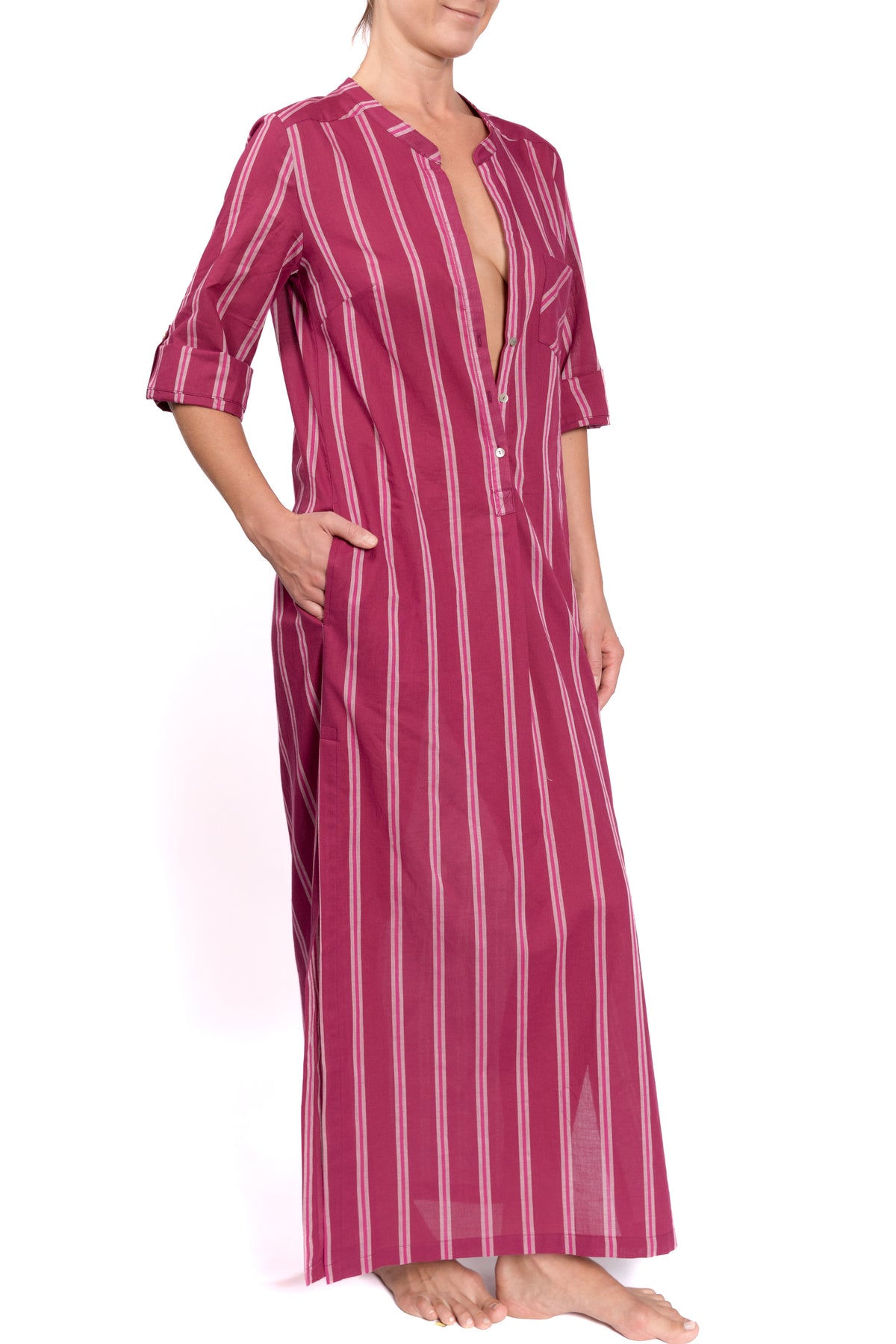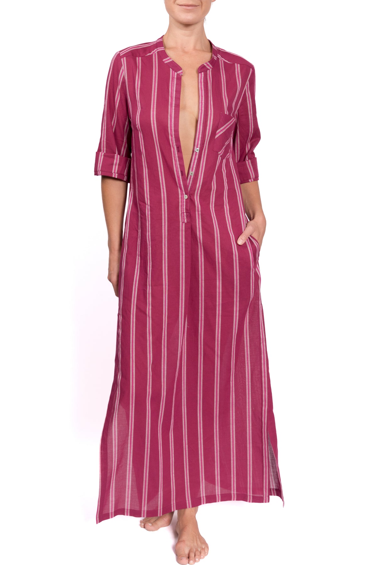Easy and chic linen deep V caftan featuring an effortless silhouette, henley collar and button-up front, button option sleeves, and high side slits.
