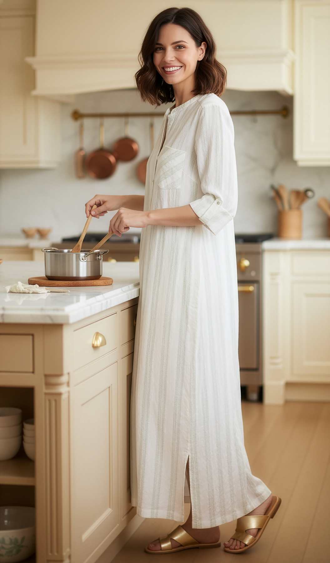 Our all-time best-seller the Tracey Caftan is easy and chic dressed up or down. With a plunging deep V, effortless silhouette, button option sleeves, and high side slits the caftan is sure to wow both at home, around the pool or on the beach. Pale mint stripes.
