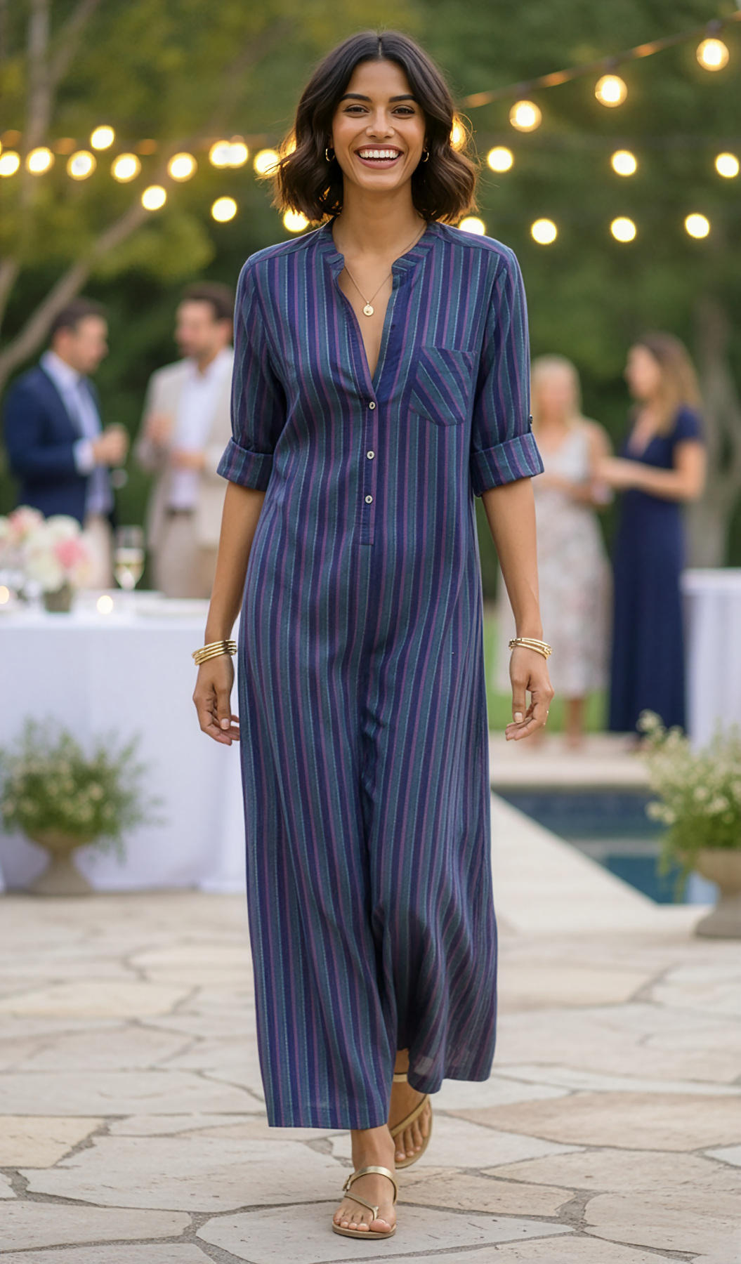 Easy and chic cotton deep V Kaftan featuring an effortless silhouette, mandarine collar and button-up front, button option sleeves, and high side slits. Peacock stripe accented with intermittent gold lurex stripe.