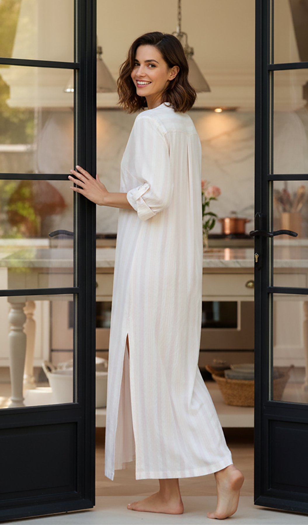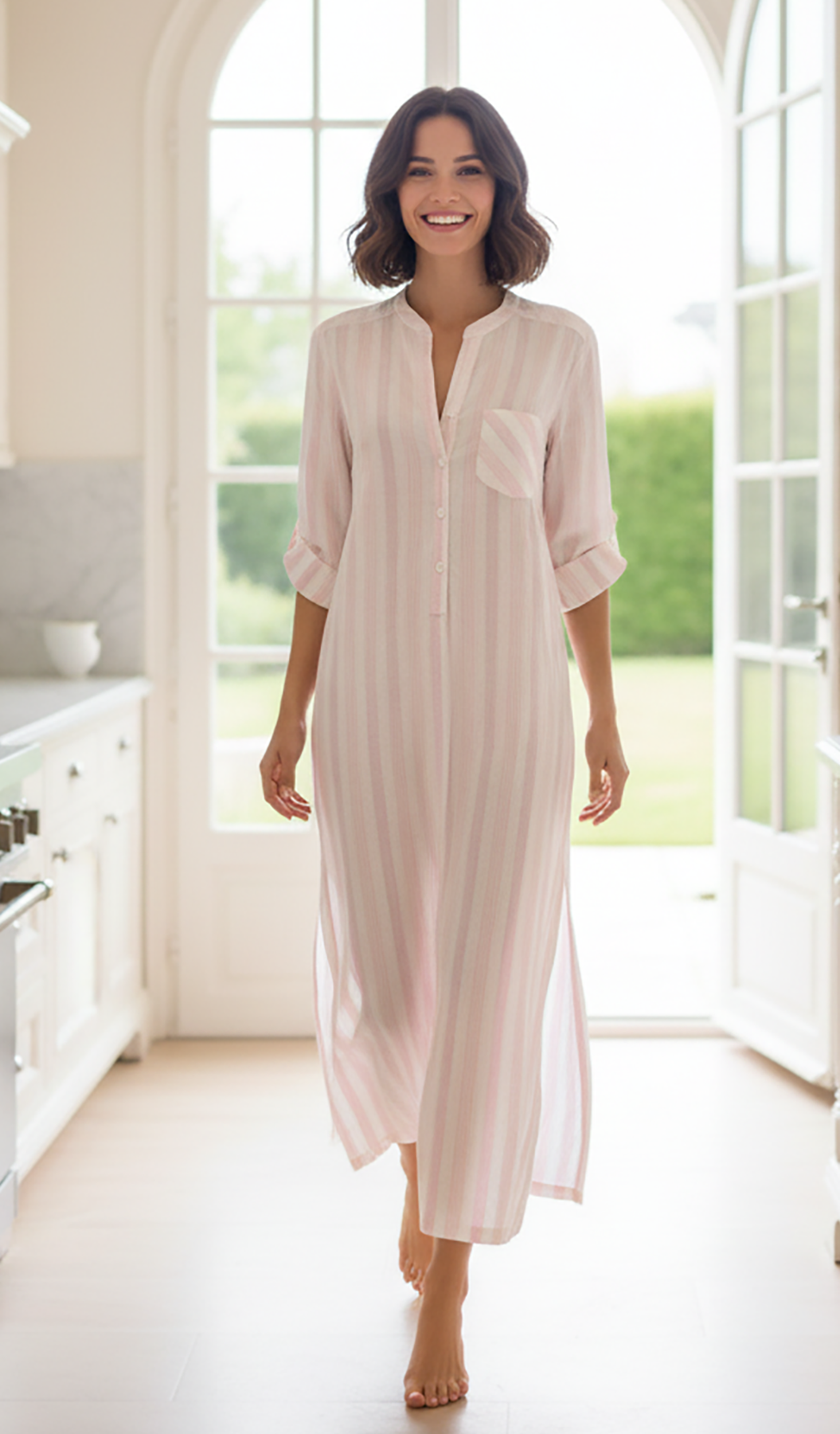 Our all-time best-seller the Tracey Caftan is easy and chic dressed up or down. With a plunging deep V, effortless silhouette, button option sleeves, and high side slits the caftan is sure to wow both at home, around the pool or on the beach. Pale blush stripes.