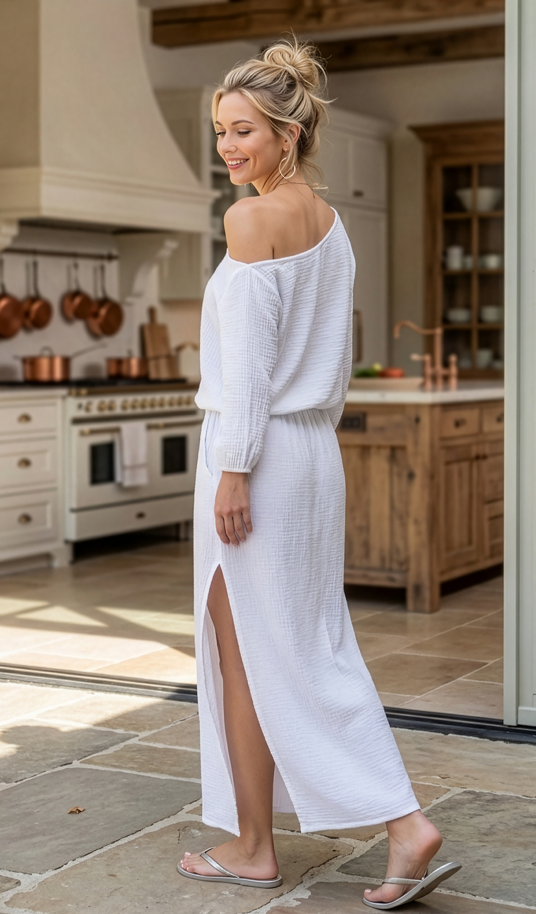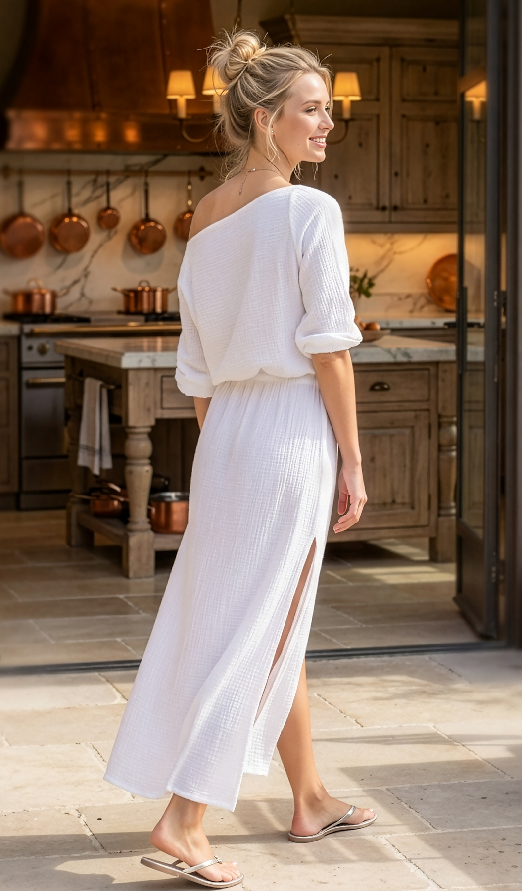 Swank slip on skirt with high stem flattering side slits. 100% cotton crinkle gauze. Perfect for warm days and nights! Great swim cover up too!