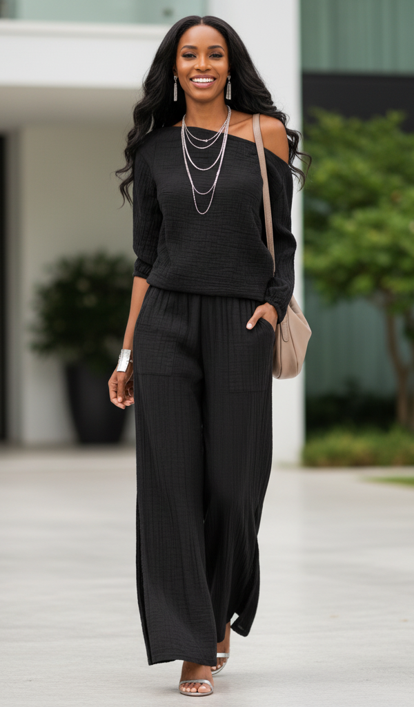 Bateau neckline, 3/4 sleeve blouse top. Clean modern lines create this effortless pop over top that can be worn with just about anything.