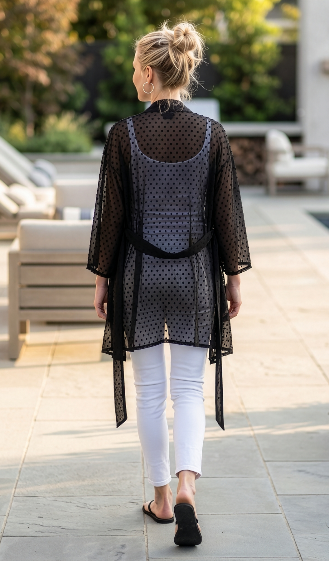 This chic, tassel-trimmed coverup features dramatic wide sleeves inspired by the traditional kimono, perfect for lounging at home, by the pool and can also be worn layered over outfit favorites.