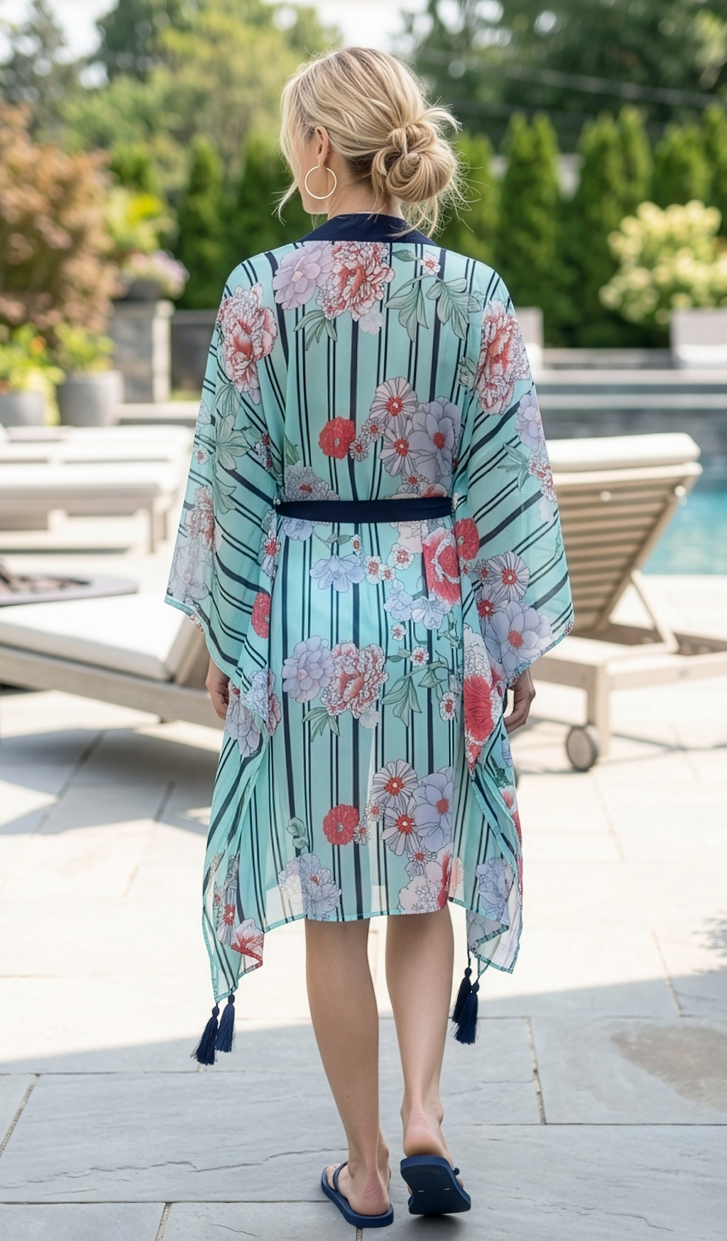 This chic tassel-trimmed coverup features dramatic wide sleeves inspired by the traditional kimono, perfect for lounging at home, by the pool and can also be worn layered over outfit favorites.