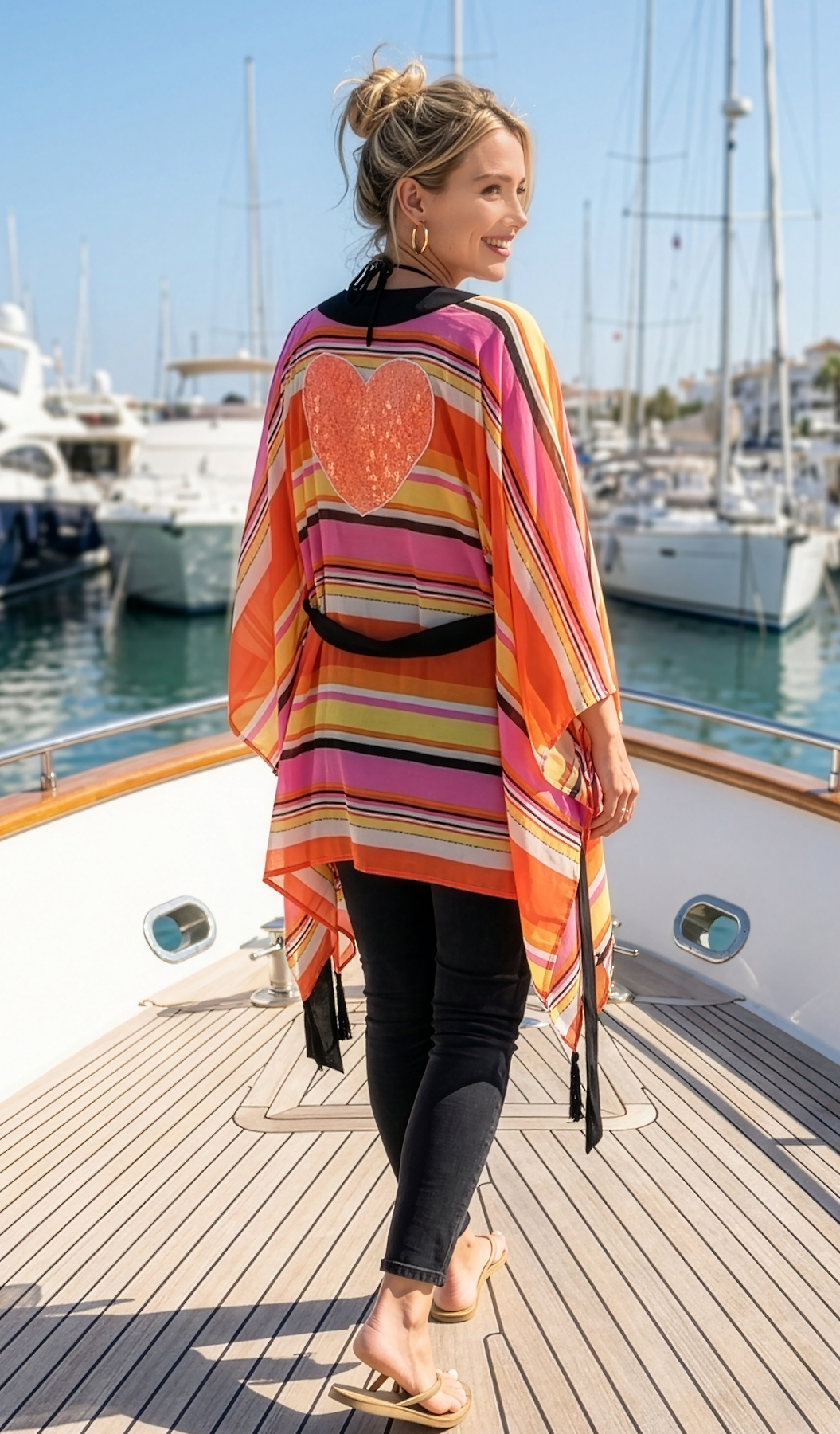 This flirty, tassel-trimmed kimono features dramatic wide sleeves inspired by the traditional kimono, and a sequined HEART on the back. This beautiful kimono can be worn over a swimsuit or layered over outfit favorites.
