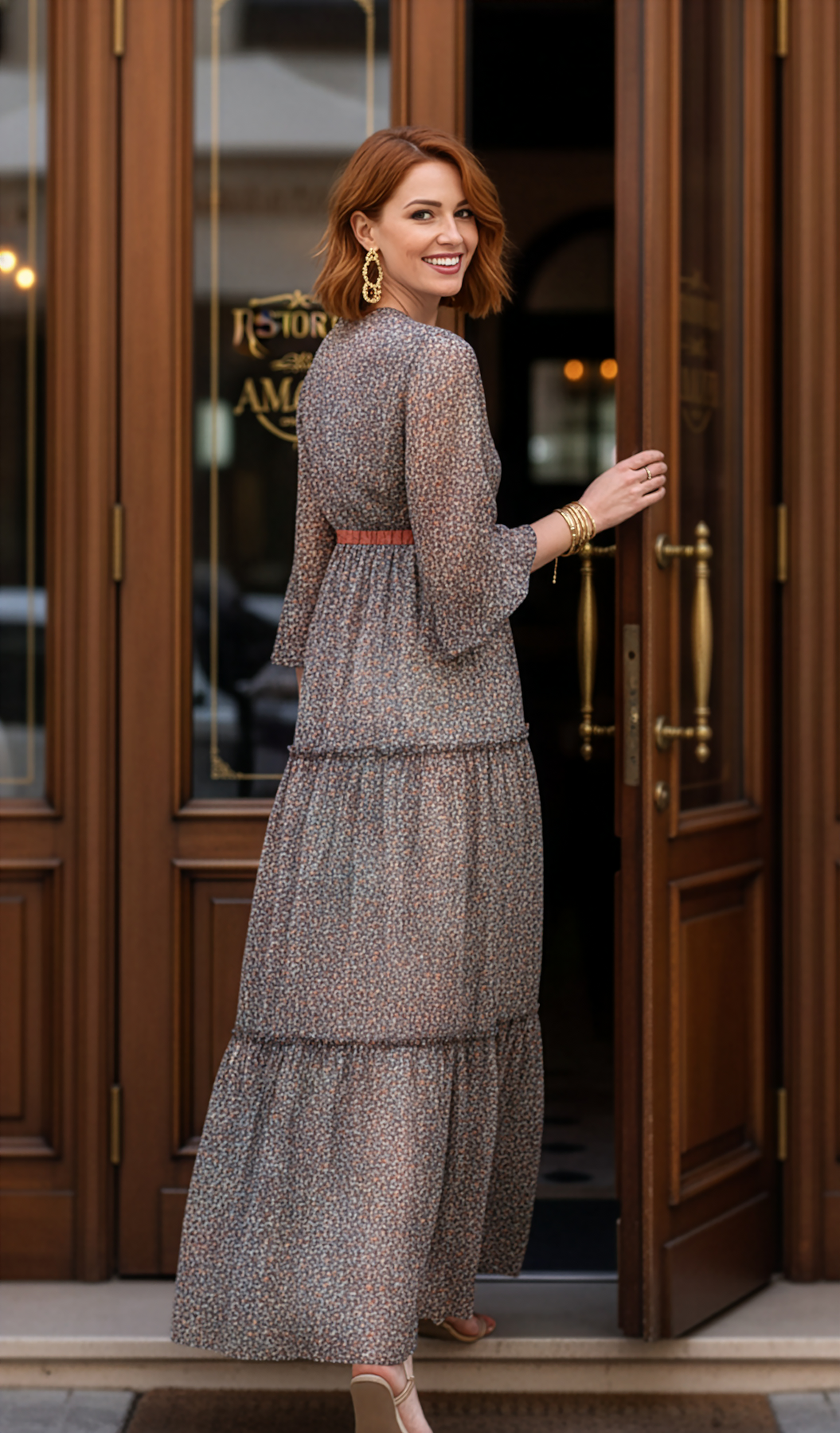 Achieve an elegant evening look with the Jennifer Dress, a full-length design crafted of sheer polyester chiffon, finished with a rust trim, and complete with flowing sleeves.