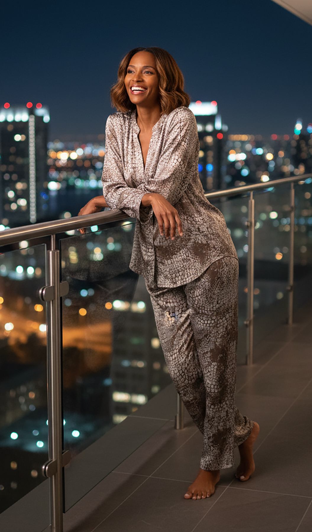 This set boasts a relaxed fit boyfriend button-down top and matching wide-leg pant. The Jamie Angela is warm but flowy to make lounging still feel elegant and comfortable.