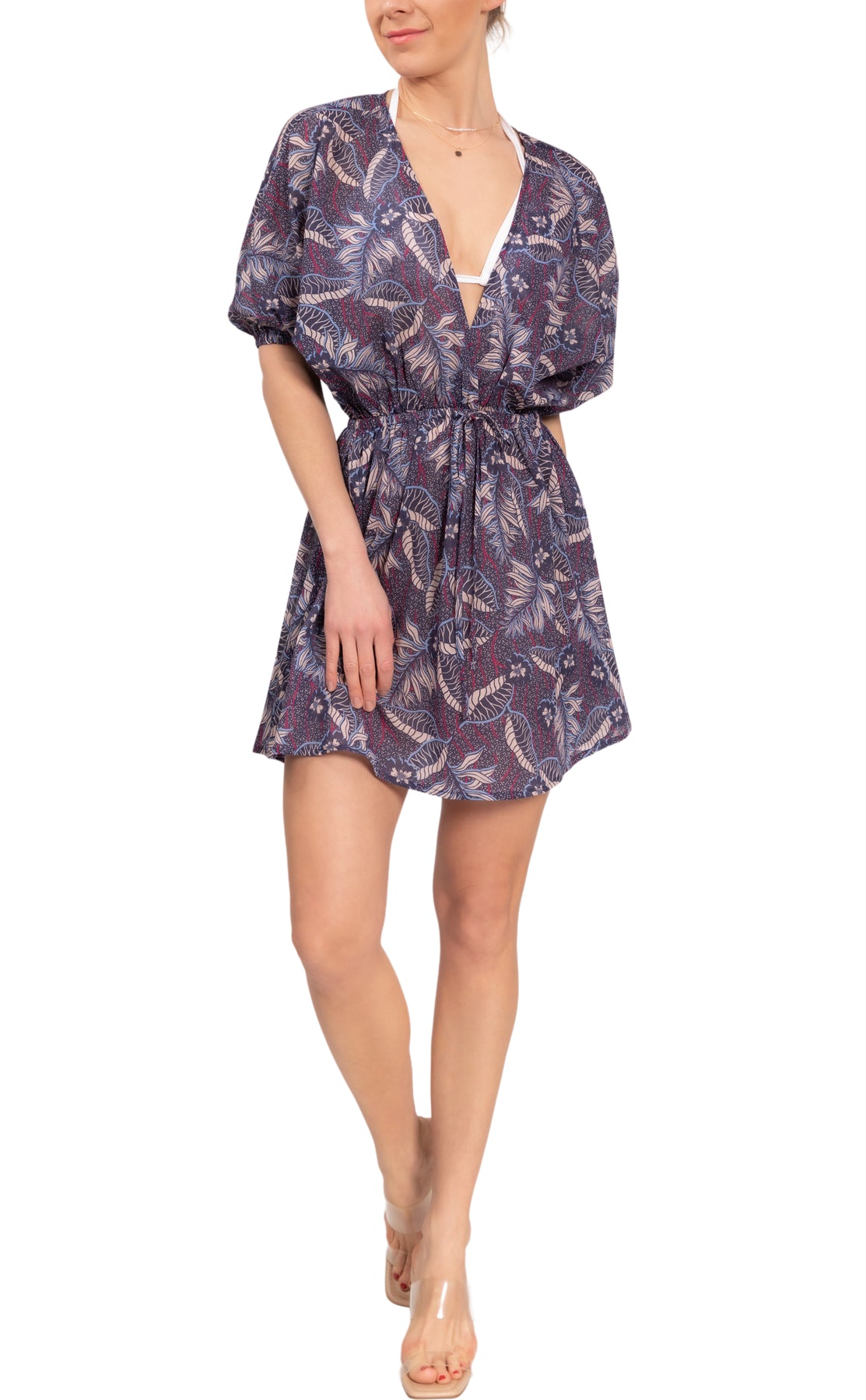 Versatile Bailee Cover Up! This deep v, elbow length sleeve  top with drawstring waist and scalloped hemline is super flattering. It can be worn layered over tank as a tunic or as a cover up over swimwear.