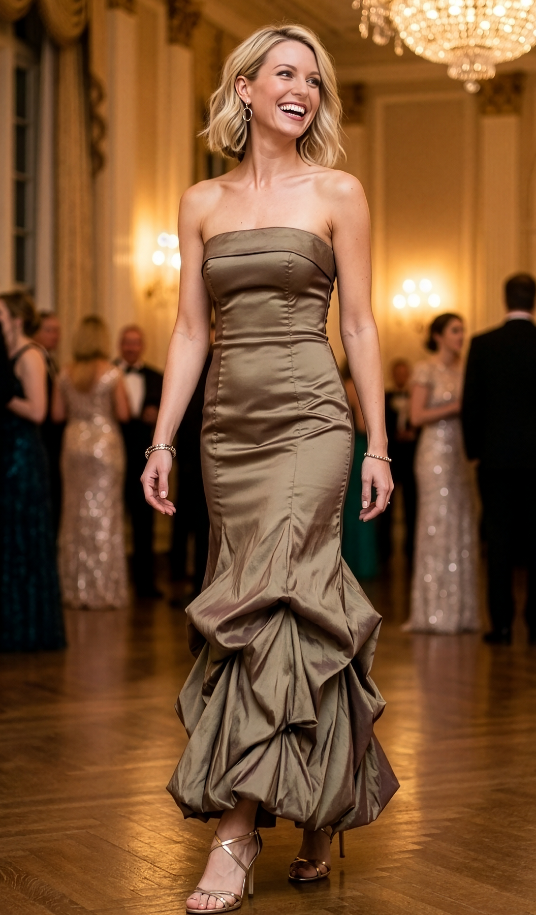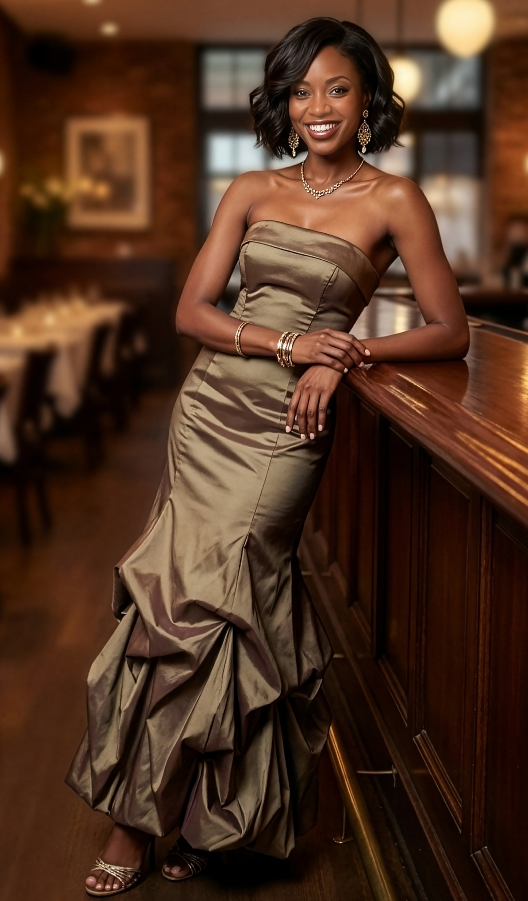 Our New COLLAB with Polli Says features a stunning evening gown that is perfect for a dressy occasion. Stretch Taffeta holds your body in this gorgeous glamorous evening dress to give a beautiful form fitting look. Cinched up all over with ties on the skirt to give a crushed balloon look with layers & layers of sumptuous fabric.