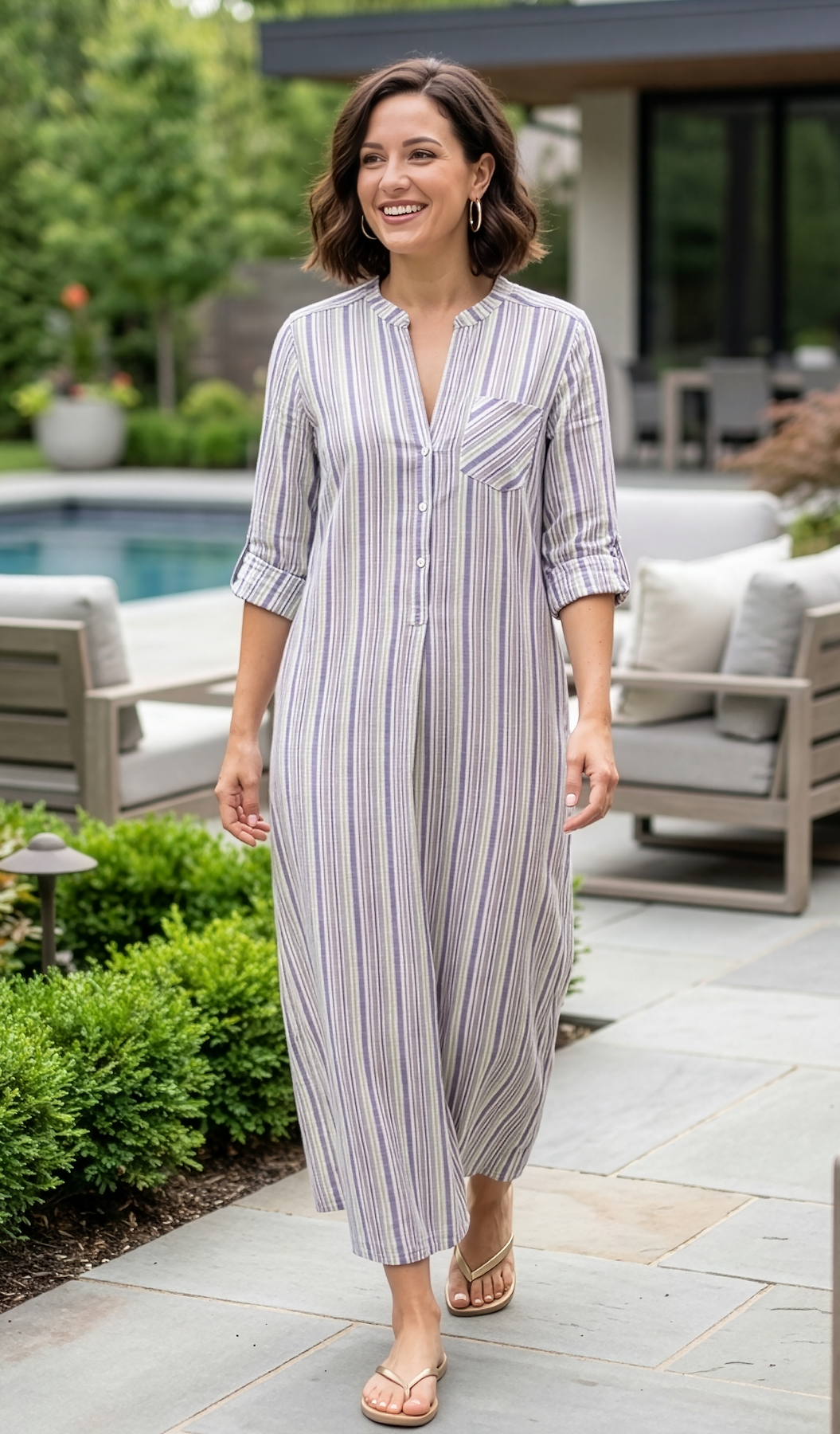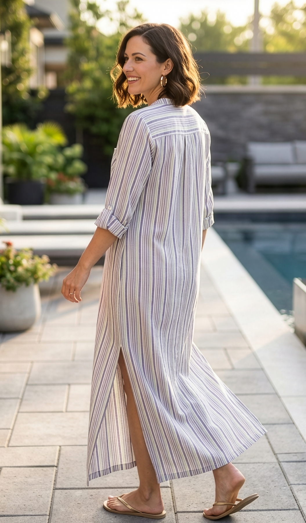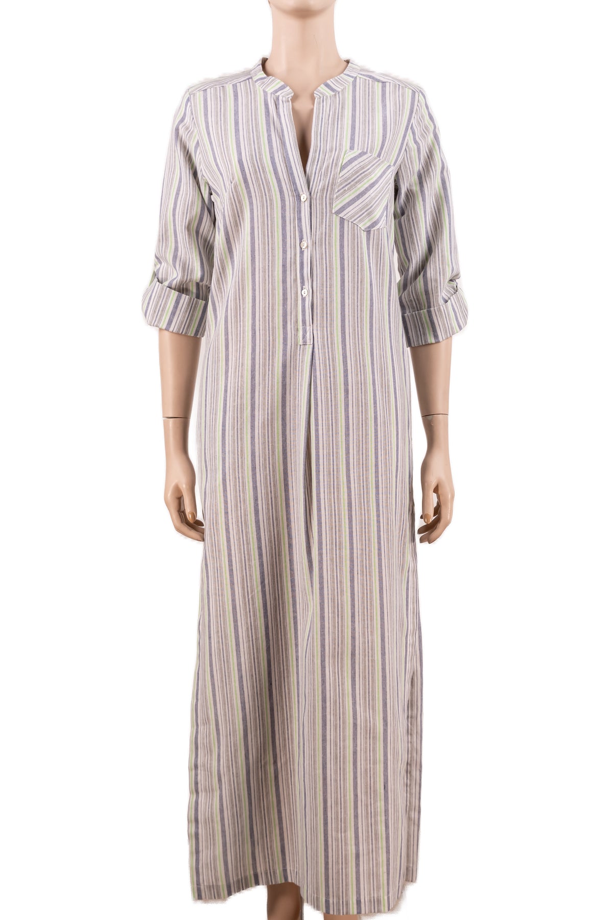 Easy and chic linen deep V caftan featuring an effortless silhouette, henley collar and button-up front, button option sleeves, and high side slits.